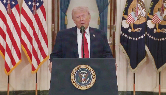 2日の東京株式市場ではトランプ米大統領の国民向け演説(写真)に対する期待が先行、寄り付き直後に日経平均株価は前日比518円高まで買われた。しかし、終了後は失望から1,466円安まで売られるなど、日中値...