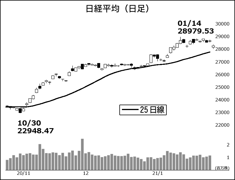 ニューヨークダウは、大統領選挙直前の昨年10月末(2万6,501.60ドル)から急落直前の1月26日(3万937.04ドル)まで16.7%高。昨年3月23日安値からなら66.4%高。