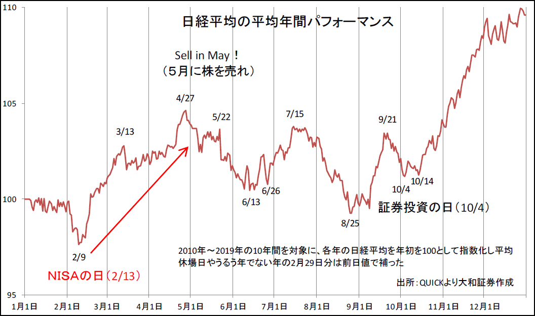 ①秋口から急伸②年明け後はもみ合いに転じ③2月初旬いったん突っ込む場面を経て④4月末に向けて再上昇――例年繰り返されるパターンで、今年は若干早めに③が生じたといったところ。レポートでは、NISAの日(2月13日)前後は「良い投資機会になりやすい」とするが、厳密に言えば、グラフ上では「2月9日」。