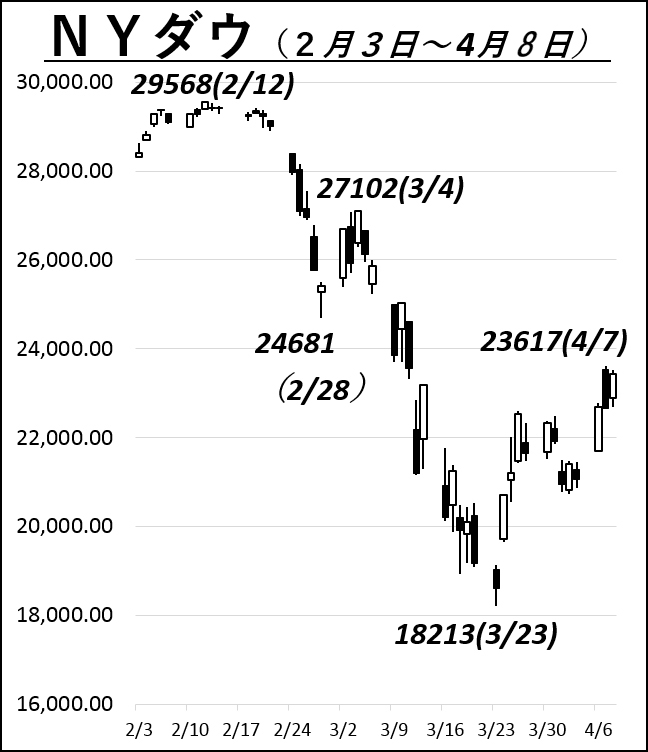 ニューヨーク州を中心に感染者数が激増し、8日時点で死者数が1.5万人近くに迫った米国ではNYダウが7日に一時、2万3,617ドルまで上昇し、3月23日の安値1万8,231ドルからの上昇率は29.6%に達した。8日も堅調に推移し、2月12日の取引時間中高値2万9,568ドルからの下げ幅の半値戻し水準に当たる2万3,890.5ドルに接近してきた(チャート参照)。NYダウほどではないが、NSDAQ総合指数は3月安値から22%、S&P500種指数も約26%アップ。