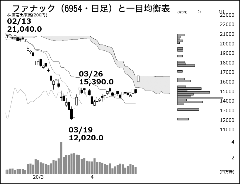アク抜け相場「序章」を彩る銘柄として、ファナック(6954)の存在感が一気に高まっている。週明け27日の東京株式市場は前週末の米国株高にも支援され、買い優勢の展開となり、日経平均は一時557円高となったが、個別株で圧巻だったのはファナック。前週末に発表した決算で悪材料出尽くし感が台頭し、ザラバで1,870円高(上昇率12.5%)の1万6,725円と、3月6日以来の水準まで跳ね上げ、戻りの新局面に突入。東証売買代金ランキングでもソフトバンクグループ(9984)ファーストリテ(9983)武田薬品(4502)任天堂(7974)などに次ぐ第6位に躍り出た。