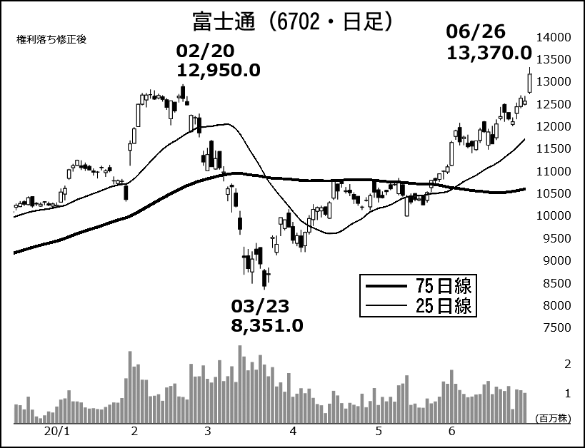 主力ハイテク株の相次ぐ上放れが注目を集めた。25日にNEC(6701)が1月14日高値を払い、26日は富士通(6702)も2月20日高値更新(一時6.3%高)。19年ぶりの高値圏。NECは26日も続伸歩調だ。