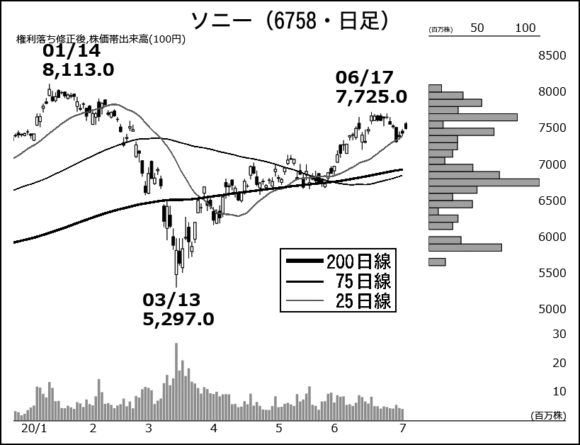 まず、本命株狙いならソニー(6758)。6月17日に戻り高値7,725円を付けたあとの調整局面でも短期線の25日線が下値支持線となり、頑強な波動をキープしている。