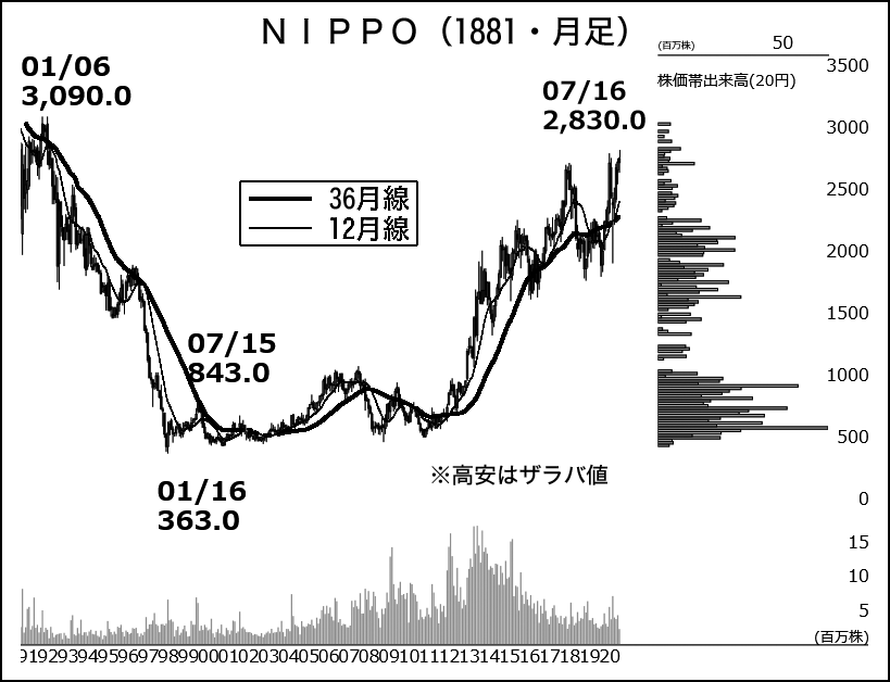道路舗装最大手のNIPPO(1881)が16日、一時80円高の2,830円まで上昇。1992年3月以来、約18年ぶりに2,800円台を回復した(チャート参照)。大規模な洪水被害を背景に、建設セクターを中心とする国土強靭(きょうじん)化関連株に関心が高まる中、その先駆けとして株価が躍動している。NIPPOの場合、ジェフリーズ証券が3,650円目標を打ち出したほか、親子上場絡みの材料も内包。3,000円を目指す可能性が高い。この銘柄をリード役とする国土強靭化関連株に復権シグナルが灯った。