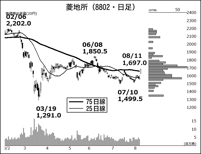3連休明けとなった11日の東京株式マーケットは不動産株が軒並み高。特に三井不動産(8801)、三菱地所(8802)、住友不動産(8830)の大手銘柄が大幅高を演じた。このうち、売買代金トップに立った三井不は一時、8.3%高。また、三菱地所も7日引け後に発表した1Q(4~6月)連結決算で営業利益がビルの賃貸利益やキャピタルゲインの増加で前年同期比15.7%増を達成し、新型コロナウイルスの悪影響を跳ね返したとの見方から、見直し買いが急増した。準大手、中堅などほかの大手不動産株にも相場的なアク抜け感が広がり始めている。