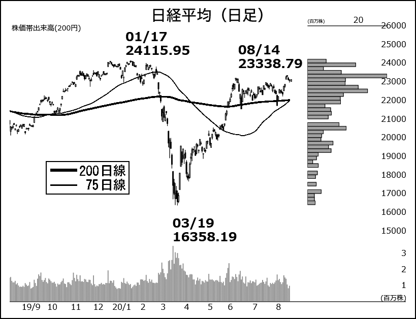 前日の米国市場でNYダウは小幅反落。追加経済対策を巡る米与野党協議に進展が見られず、法案成立が9月にずれ込む可能性が高まった。アマゾンやアップルなどのハイテク株は新型コロナウイルス下でも強いという見方で買われました。S&P500は続伸となり、半年ぶりに最高値を更新。ナスダック指数は続伸です。本日の東京市場は小幅安での寄付き後に、円高進行の一服から買い戻されプラス圏での推移。積極的に買い進む向きは見られずに見送り商状の中、反発となり大引けの日経平均は59円高の2万3110円。売買代金は1兆6966億円と薄商い継続。