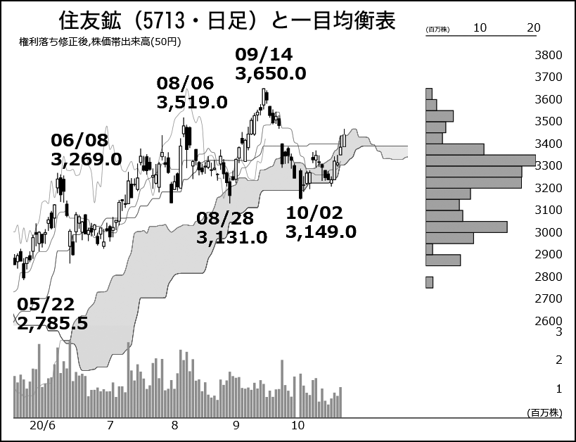 住友鉱は22日前場に一時、前日比85円高(2.51%上昇)の3,470円まで上昇。株価の抵抗帯となる日足・一目均衡表の先行スパン(いわゆる雲)上限ラインを再び越え、9月の戻り高値3,650円にトライする足取りに変わった。