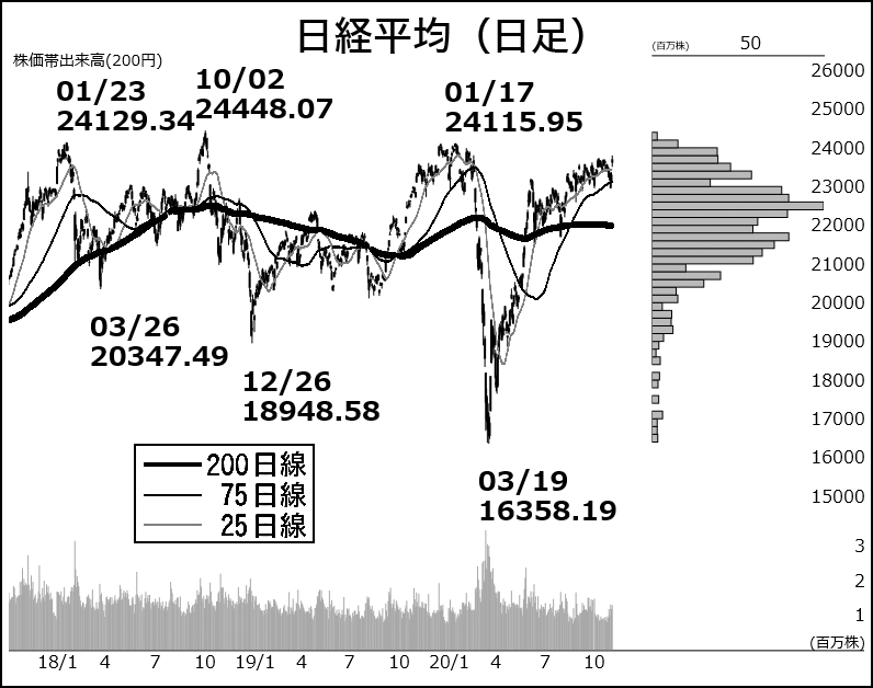 別掲のチャートから分かるように、ザラバベースで見ると日経平均は①2018年1月23日の2万4,129円②18年10月2日の2万4,448円③20年1月17日の2万4,115円と、3度にわたって2万4,000円台に乗せたものの、いずれもそこからは伸び切れなかった。つまり、2万4,000円台は、ガチガチの上値抵抗ゾーンである。