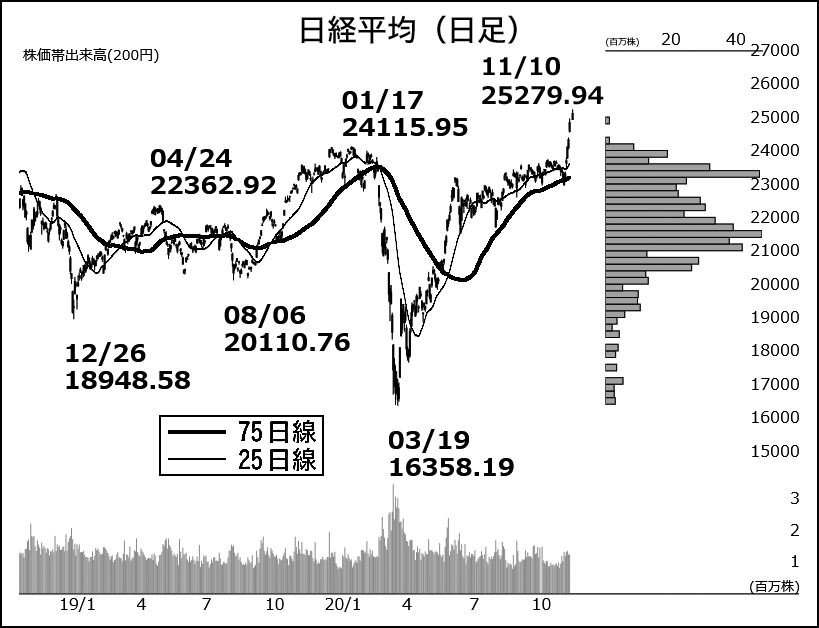 米ファイザーが共同開発中の新型コロナウイルスワクチンの感染予防有効率が90%超となったことでNYダウが急騰し、日経平均は寄り付きから25,000円乗せで始まった。
