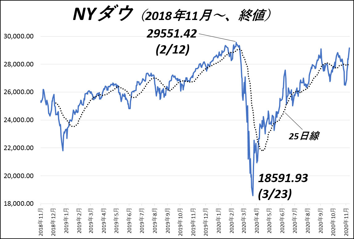 米医薬大手ファイザー社が最終臨床試験で新型コロナウイルス感染抑制に極めて効果的なワクチンを開発したと日本時間9日夜に発表。これをきっかけに、NYダウが一気に押し上げられ、取引時間中には前日比1,744ドル高(6.18%高)の2万933.83ドルと空前の3万ドルに肉薄した。終値でも834ドル高(同2.94%高)の2万9,157.97ドルと、2月12日に付けた2万9,551.42ドルに急接近(チャート参照)。