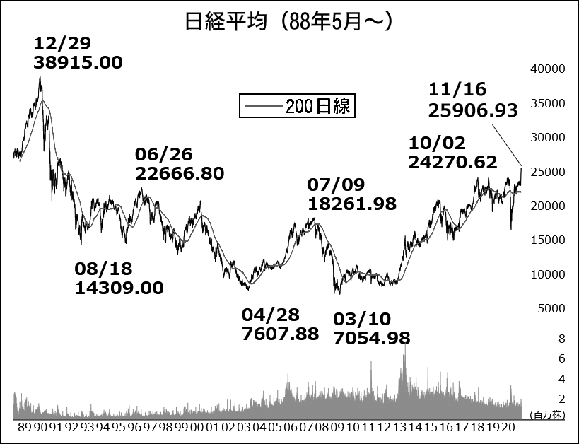 しかし、コロナ感染者数は増えるばかり。回復傾向にあるとはいえ低水準にある企業収益も気になる。売り越し基調にあった海外投資家は11月第1週になって、現物、先物と合わせ1兆990億円の大幅買い越し越しに転じたが、国内の市場関係者の多くは疑心暗鬼に包まれ、株高の裏付けとなる材料(=事実)探しに明け暮れる日々だ。こうした状況は、なおしばらく続く。そして、マーケットに“納得感”が広がり、先高観が横溢(おういつ)するようになったとき、すべてを織り込んだ株式相場は株価のトレンド、つまり向きを変える。