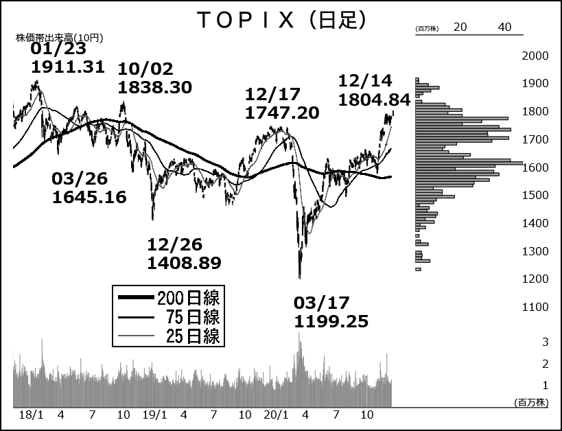 14日のマーケットで一つのポイントとして注目されたのがTOPIXの躍動だ。11月27日にマークしたザラバ高値1,792.97ポイントを更新し、前場中盤には1,800ポイント台乗せ。これによって、次のフシ目としては18年10月2日に付けた1,838.30ポイントが意識されている。