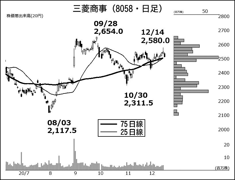 15日の東京株式市場は前日のNYダウの下落やコロナ感染拡大への警戒感が重なって再びこう着ムードが広がった。日経平均は大引け44円安。ただ、押し目を狙う動きは健在で、下値は限定的だ。年内相場も残すところ約2週間。今後、掉尾(とうび)の一振期待や新春高観測を呼び込む格好で存在感を強めそうなセクターの一つに総合商社株がある。各国の景気刺激策が追い風に働く国際景気敏感株で、かつ屈指のバリュー株。大手商社の多くは株価意識が強く、株主還元策期待も下支え要因になる。