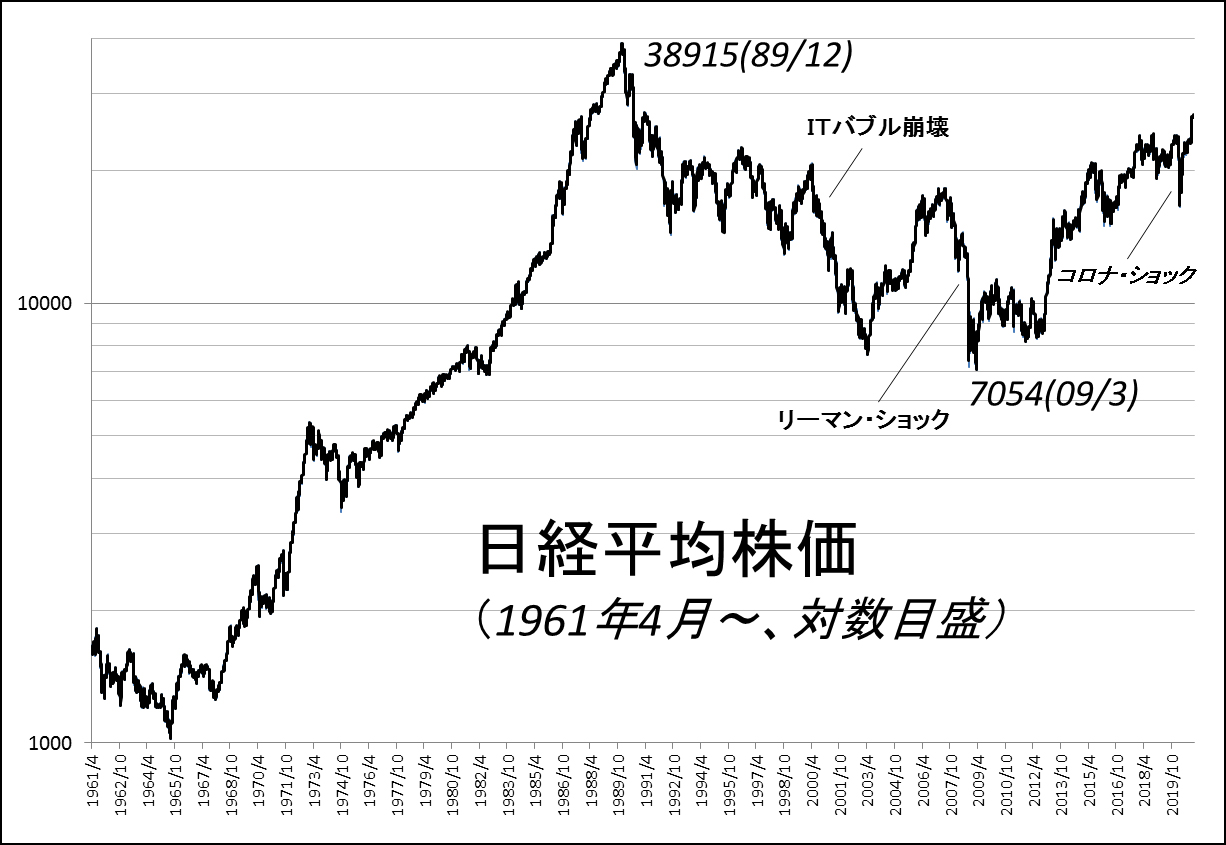 微調整を挟みつつ、ダイナミックな上げ相場はなお続く、というのが、3月下旬以降、時に白い目を向けられながらも強気の相場観を押し通してきた私の見方だ。対数目盛で描示した1961年以降の「日経平均・60年チャート」(別掲参照)からは、89年末に付けた史上最高値も次第に視野に入りつつある。
