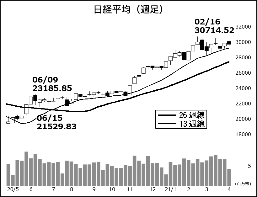 日足チャート上では、3万円の大台に乗せるも、上値は抑えられ僅かに5日移動平均線(2万9798円)を割り込んだ。上昇を見せる25日移動平均線(2万9442円)がサポートとなっている。週足では、3万円の大台を回復したものの維持できず、陰線を引く形。13週移動平均線上でのトレンドは継続。