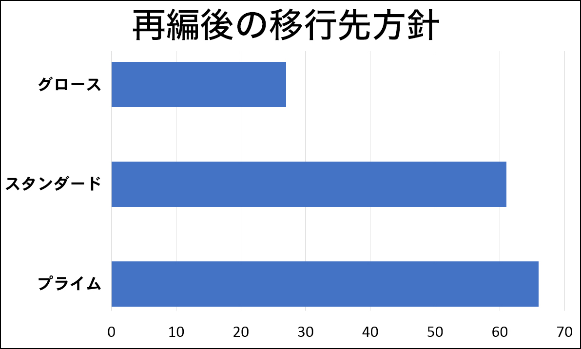 プライム市場に移行する方針の企業は66社(42.8%)、スタンダード市場61社(39.6%)、グロース市場27社(17.5%)と4割以上がプライム市場を希望していた。市場変更方針は8社(5.1%)で、維持(1部→プライム、2部→スタンダードなど)は145社(94.1%)、上場廃止を検討している企業も1社あった。