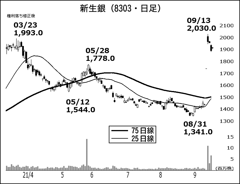 もっとも、新生銀行はSBIによるTOB価格(2,000円)を5%ほど下回る水準での小動きにとどまる。