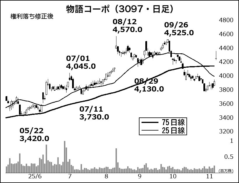 「焼肉きんぐ」を主力とする物語コーポレーション(3097・P)は、決算を受けて一時11.6%高と急騰。今6月期第1四半期決算は売上高355億9,900万円(前年同期比19.6%増)、営業利益27億3,300万円(同15.6%増)と2ケタ増収益を達成した。焼肉業態では平日夜・ランチ帯を中心とした来店客数の減少を主因に既存店売上高が前年割れとなったが、これをラーメン業態や寿司・しゃぶしゃぶの食べ放題専門店「ゆず庵」業態が補った。いずれも来店客数・客単価ともに好調で、価格改定や高付加価値商品の開発などが功を奏している。
