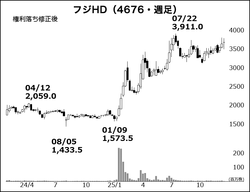 26日でちょうど1年になる。フジテレビと中居正広氏の「女性トラブル問題」を報じた週刊文春発売日からだ。当時のフジ・メディアHD(4676・P)の値動きを振り返ると、発売前日から始まった続落を翌年1月9日までの8に伸ばし、この間14.1%安(1,863円→1,599円)。報道6日前の野村証券買い推奨で目先人気を集めていた分、ちょうどカウンターのような格好となった。そのまま奈落の底に沈むかと思われたところから始まった快進撃はチャート参照の通りだが、結果論とはいえ、野村の見立てが正しかったことになる。同証券はその後も小刻みに目標株価引き上げを続け、直近11月28日付では4,500円を掲げている。