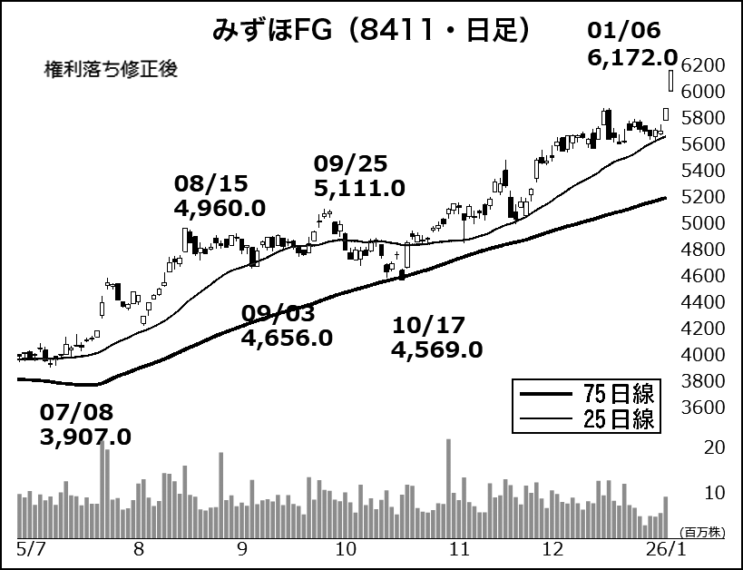 こうした状況下、メガバンク、地銀、生損保などの金融セクターに昨年来高値を更新する銘柄が続出。この日は上昇一服となったが、植田和男・日銀総裁の発言を受け5日の国内債券市場で長期金利の指標となる新発10年物国債の利回りが一時2.125%まで上昇、1999年以来27年ぶりの水準に達した。全国銀行協会の新年会で植田総裁が「経済・物価の情勢に応じ引き続き政策金利を引き上げる」などと述べたことがきっかけ。従来のスタンスを踏襲した発言ながら、2026年の主要テーマと目される「金利のある世界」があらためて意識された格好。また、高市政権発足後は財政懸念から1ドル=158円付近まで円安が進む場面も見られた。円安の進行回避の面から日銀の政策金利引き上げに動きやすくなると見方も出ている。