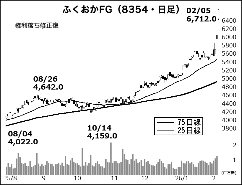 また、4日の米国市場でAMDが大幅安となり他の半導体株に売りが拡大、ディフェンシブが買われた流れが5日の日本市場にも波及。業種別では「医薬品」を筆頭にディフェンシブセクターが上昇率上位を占め、高値銘柄も続出。前引け時点で高値銘柄は消費減税の恩恵享受が期待される「食品」で20社超、ウォーシュ氏FRB(米連邦準備制度理事会)議長就任で日銀利上げペース加速・鈍化で見方は割れるものの追加利上げ方向に変わりなく利ザヤ拡大・低PBRの宝庫「地銀」は50社を超えた。