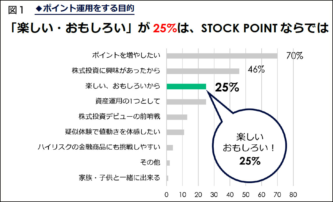 「ポイント運用」サービスを開発・提供するSTOCK POINTがユーザーに実施、小学生から70歳以上の幅広い年代1万1,776人から回答を得た今回のアンケート。「ポイント運用」をしているユーザーに「ポイント運用をする目的」(図1)を聞いたところ、「株式投資に興味があったから」「資産運用のひとつとして」「株式投資デビューの前哨戦」など「投資の練習」に充てるケースが多い中で、「楽しい、おもしろいから」との回答者が25%あった。