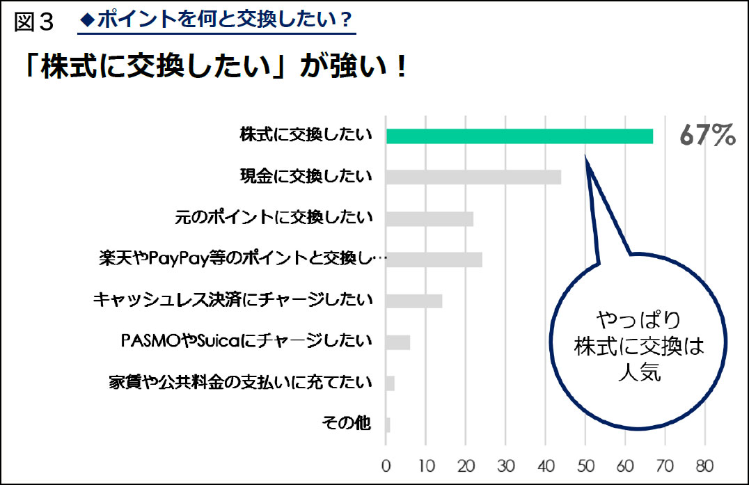 「株式投資や資産運用への興味」(図2)との質問には「興味あり、証券口座保有」が68%、「興味あるが、証券口座未保有」が24%と、92%のユーザーが株式投資への興味を示しており、結果、「ポイントを何と交換したい?」(図3)との質問には67%が「株式に交換したい」と回答している。