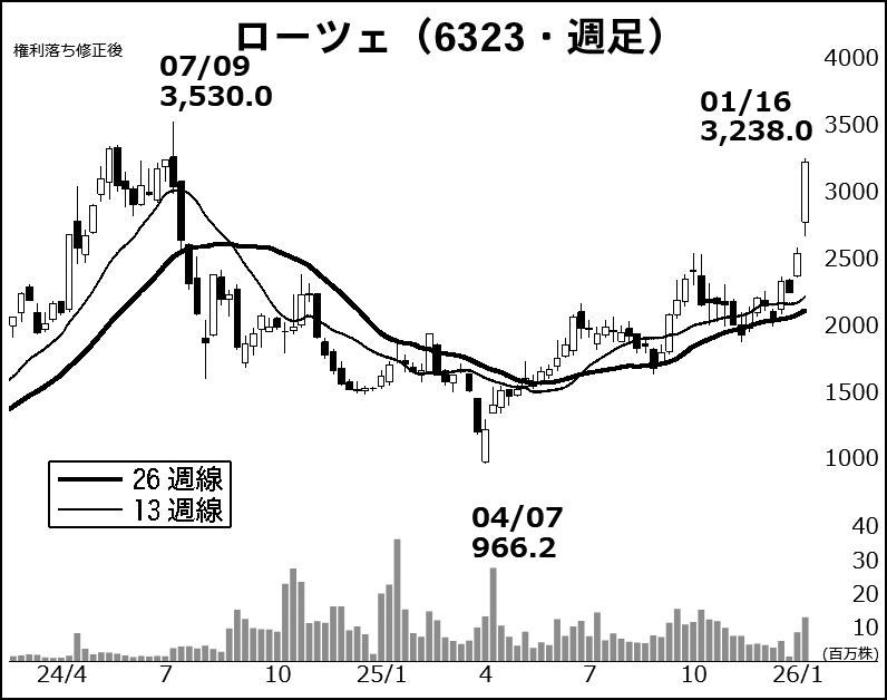 16日は主力クラスではディスコ(6146・P)、レーザーテック(6920・P)、東京エレクトロン(8035・P)、SCREENHD(7735・P)などが昨年来高値を更新した。このほか。台湾・韓国のファウンドリー、半導体メーカー向けに強みを持つ超純水装置のオルガノ(6368・P)、栗田工業(6370・P)、野村マイクロ・サイエンス(6254・P)が高値となった。KOKUSAI ELECTRIC(6525・P)、JET(6228・S)、TOWA(6315・P)などもマークしたい。
